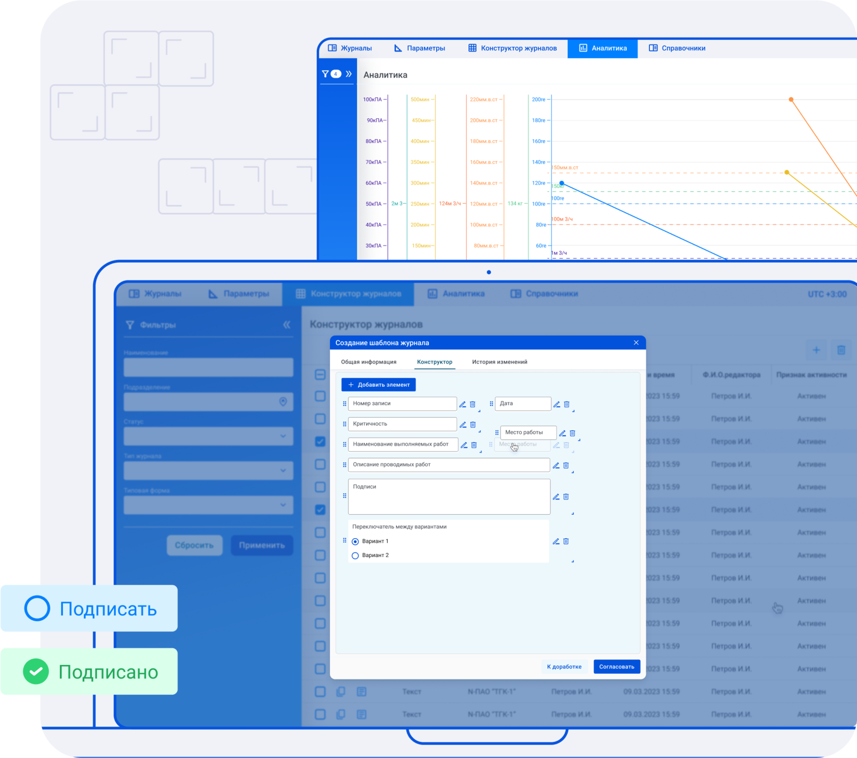 Наличие гибкого конструктора для создания журналов и удобного поиска документации даже в ретроспективных данных