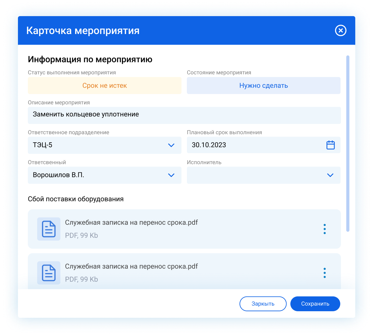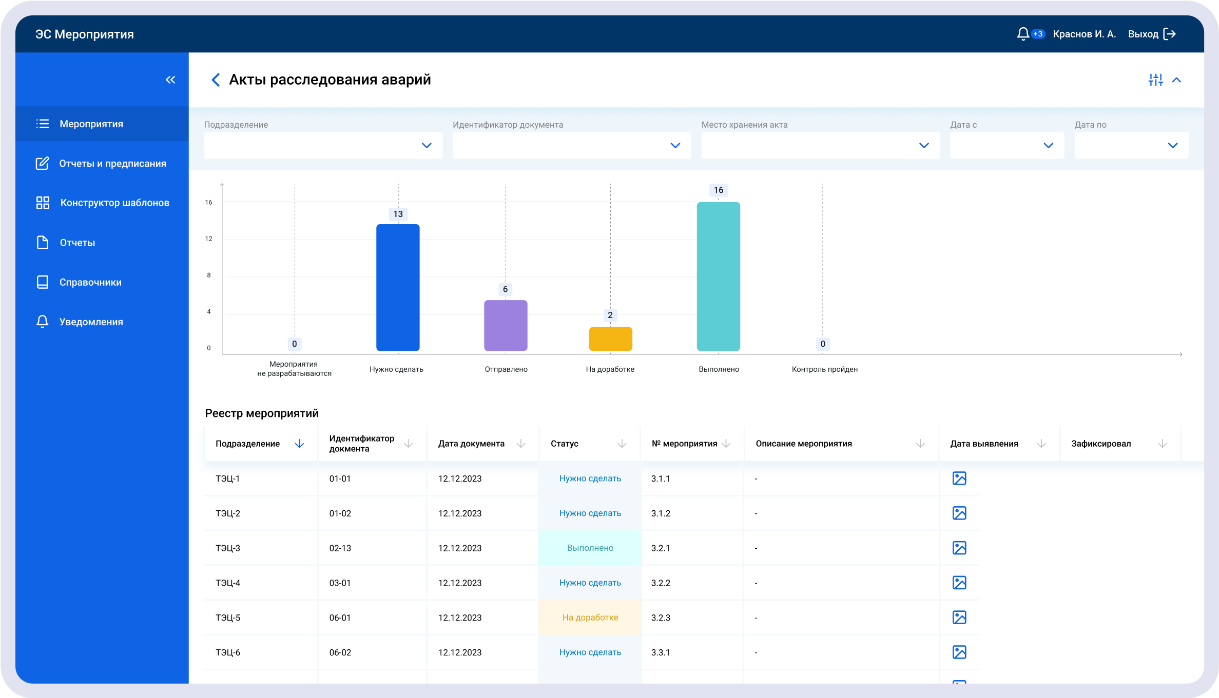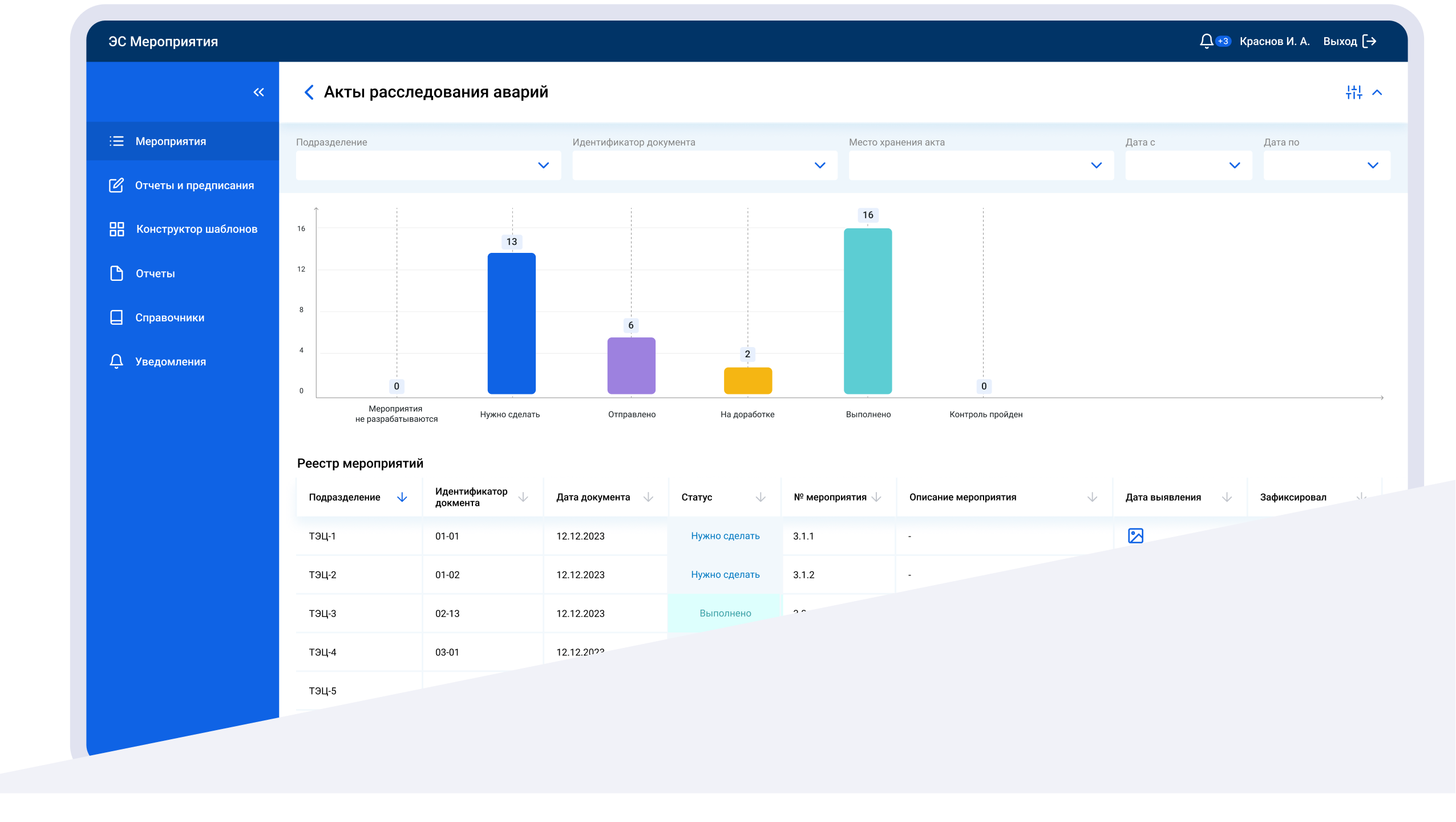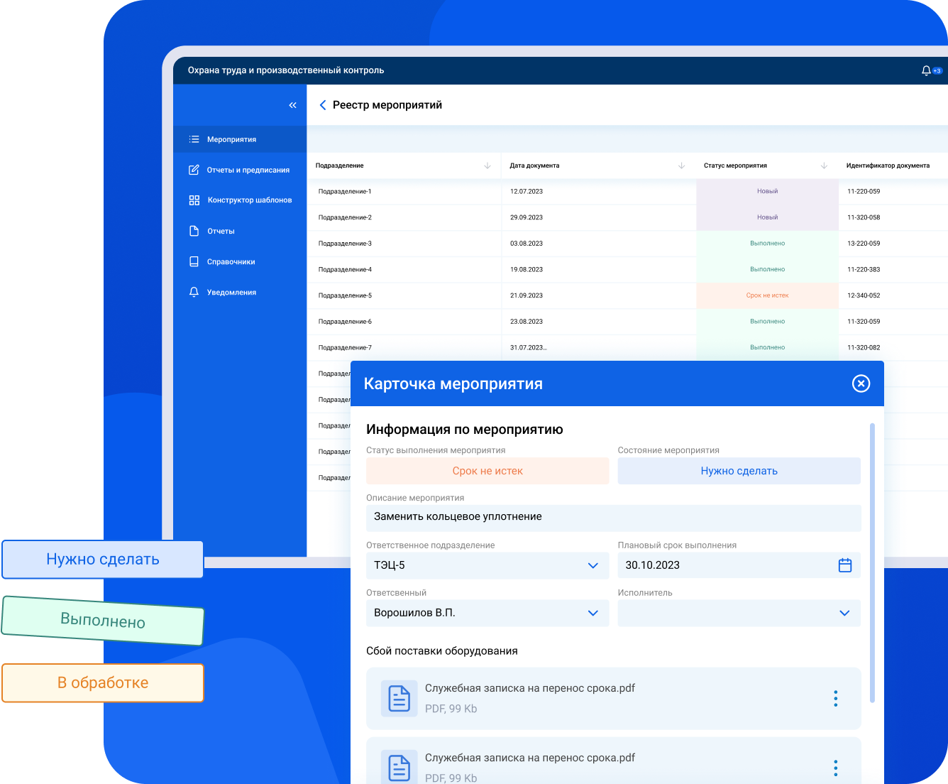 Система помогает контролировать исполнение мероприятий на всех уровнях управленияза счет создания единой базы, учитывающей различные источники замечаний или НПА