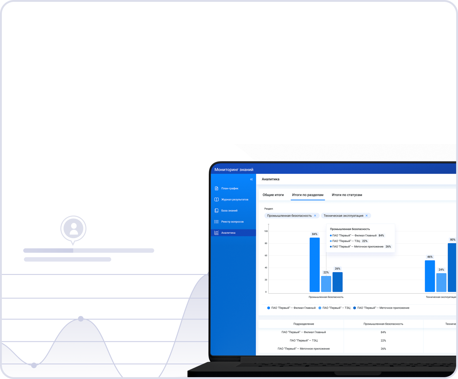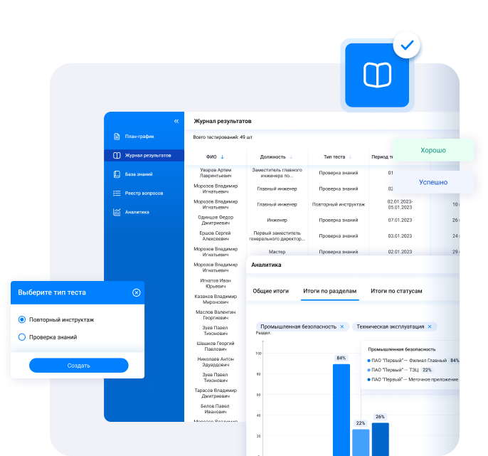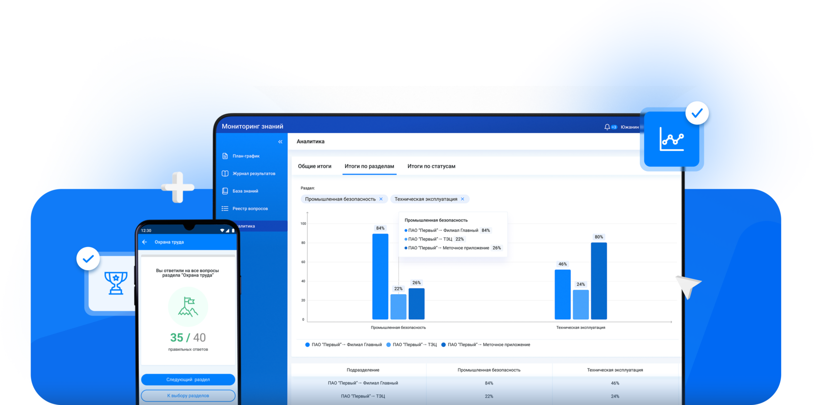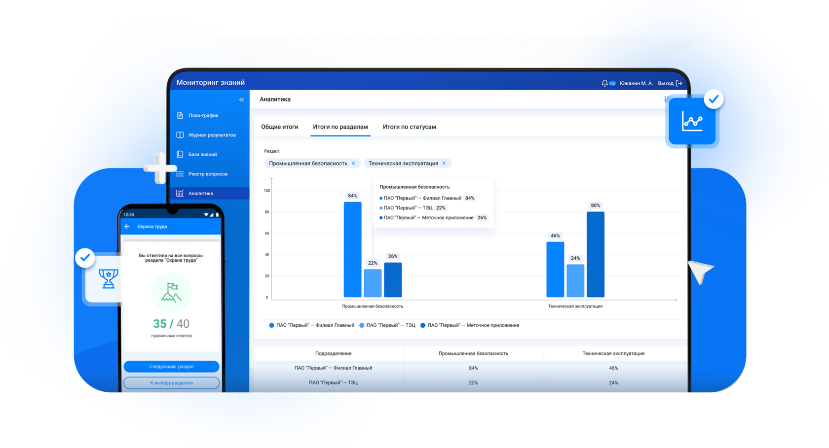 Руководители получают статистику прохождения тестов по темам и используют данные для управления развитием компетенций персонала